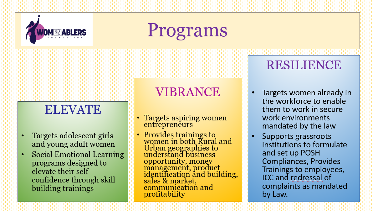 To create a secure and stress free environment for women workers/ employees and provide trainings that demystify the Sexual Harassment of Women At Workplace (Prevention, Prohibition and Redressal) Act 2013;